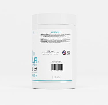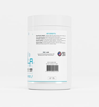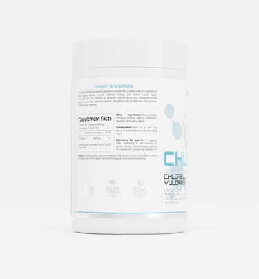 CHLORELLA es un suplemento dietario natural que contribuye al bienestar integral y la energía celular. Conservar en un lugar fresco y seco, alejado de la luz solar directa. Los resultados pueden variar según la alimentación, el metabolismo y los hábitos de vida.