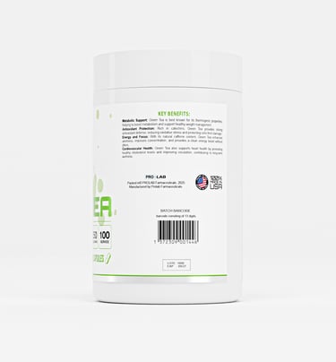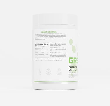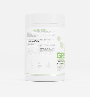 GREEN TEA es un suplemento dietario natural diseñado para complementar un estilo de vida saludable. Conservar en lugar fresco y seco, alejado de la luz solar directa. Los resultados pueden variar según la alimentación, la actividad física y los hábitos diarios.